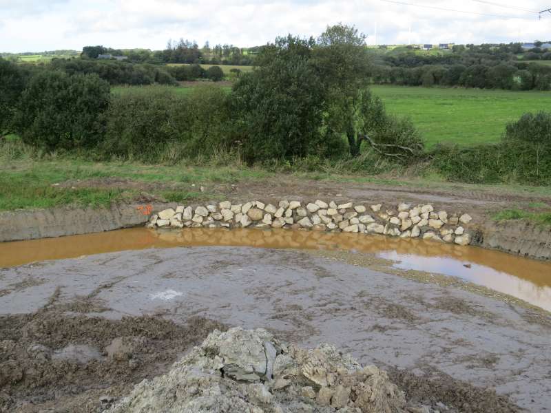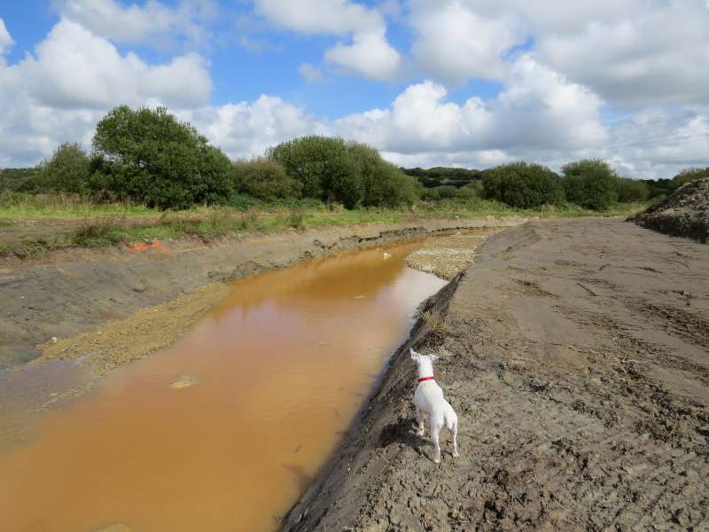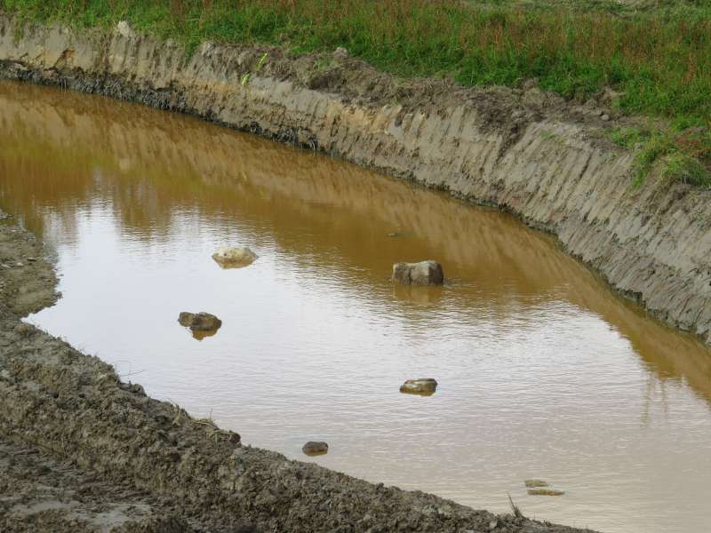 Un petit tour côté amont du chantier: Le creusement du nouveau lit est terminé. Le batardeau sera ouvert à la fin du chantier, comme pour la partie aval. Des blocs de granit ont été immergés dans la partie du cours d'eau qui sera conservée. Là aussi, les aménagements pour naturaliser la future rivière sont commencés. La couleur orange de l'eau n'est pas dûe à une pollution, le sol est riche en fer, et ce sont les infiltrations qui colorent l'eau stagnante.