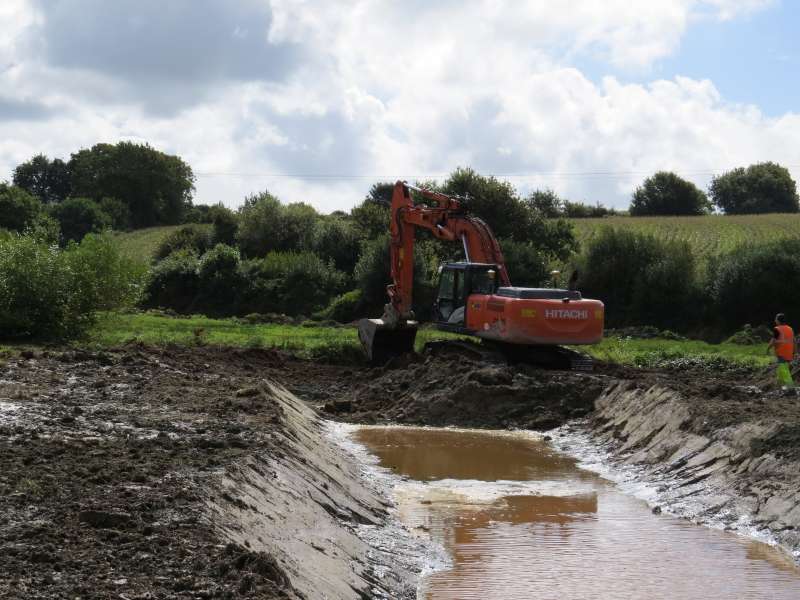 La section centrale est plus avancée, les aménagements sont complètés par la pause d'embacles (troncs),de caches à poissons et la plantation d'hélophytes (plantes semi-aquatiques)